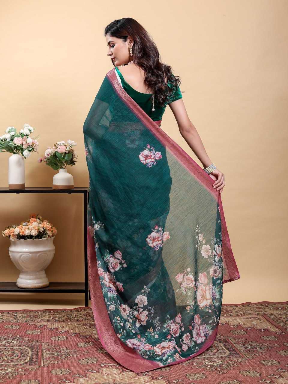 This exquisite saree is crafted from Jacquard Patta Linen Cotton, offering both comfort and sophistication. Featuring a deep teal/emerald green base adorned with multi-colour large floral digital prints, it exudes a vibrant and elegant appeal. The saree is beautifully complemented by a broad, luxurious contrast pink/maroon zari weave border, adding a touch of grandeur. It comes with a matching unstitched designer blouse piece, completing the refined look.